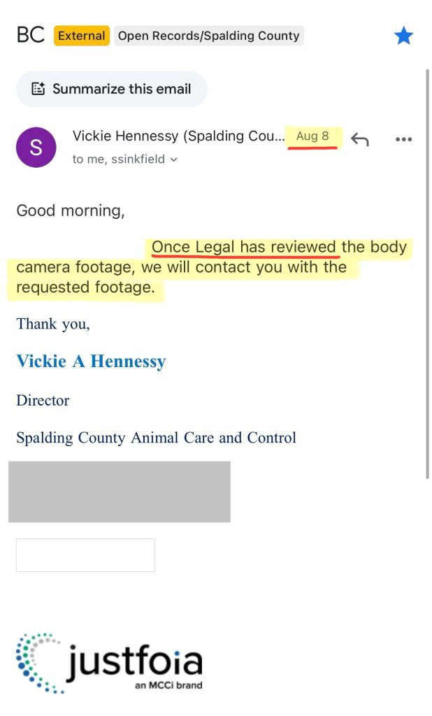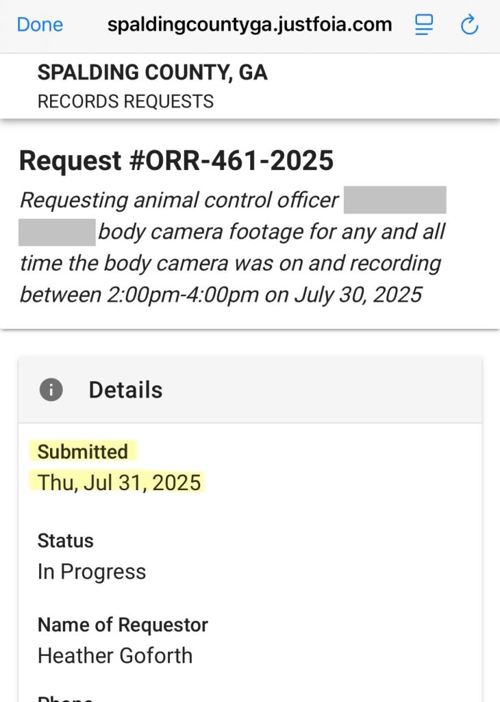🗓️ 7/31/25: I filed an ORR for the ACO’s body camera footage. It was on and recording both at the shelter and at the vet.