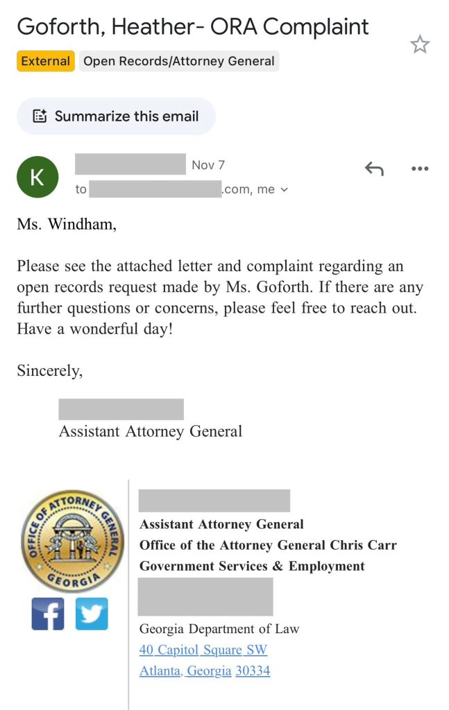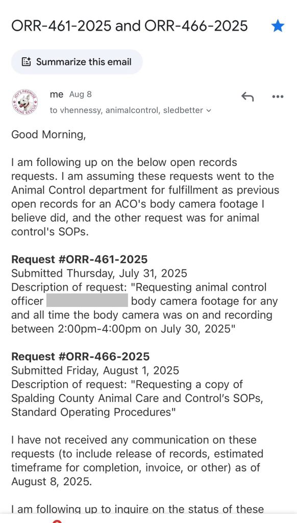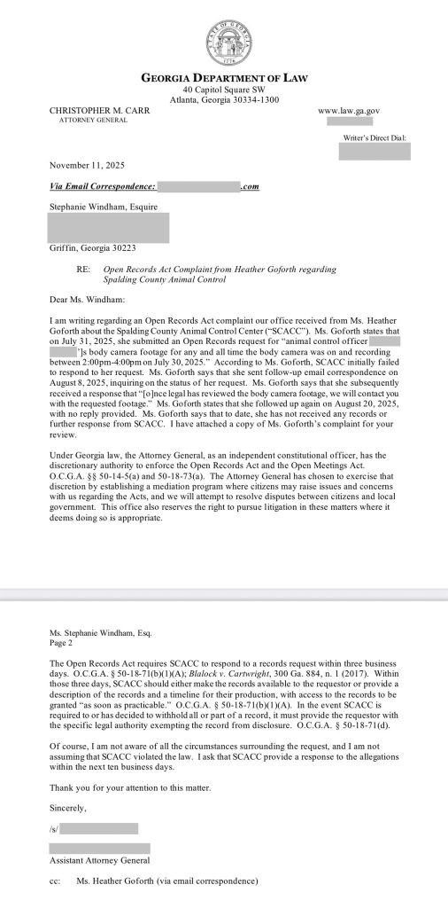 🗓️ 11/7/25: Spalding County received a letter from the state Attorney General’s office due to lack of adherence to state laws with this ORR (marking the second letter the state has sent Spalding in recent months for SCACC requests).