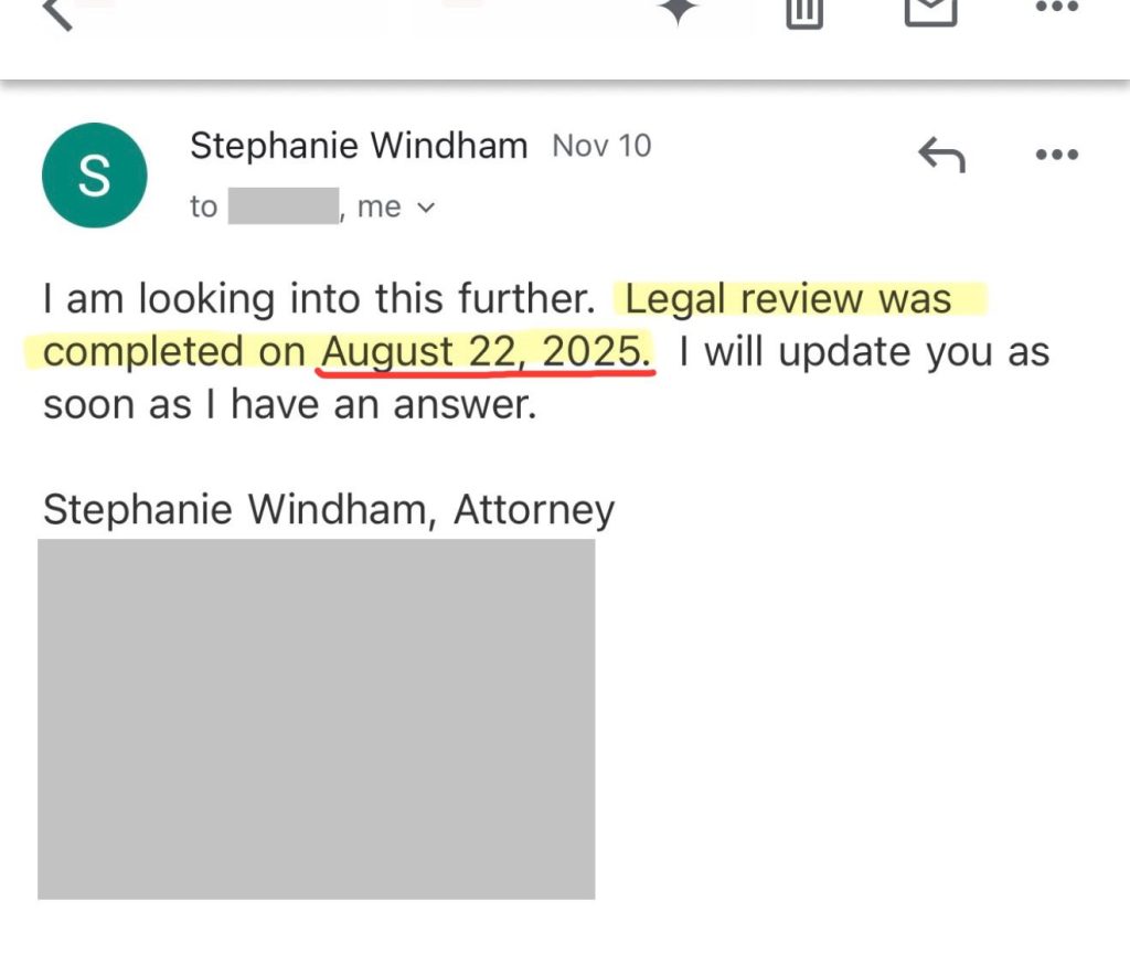 🗓️ 11/10/25: County attorney sends response regarding legal review having been completed two and a half months ago.